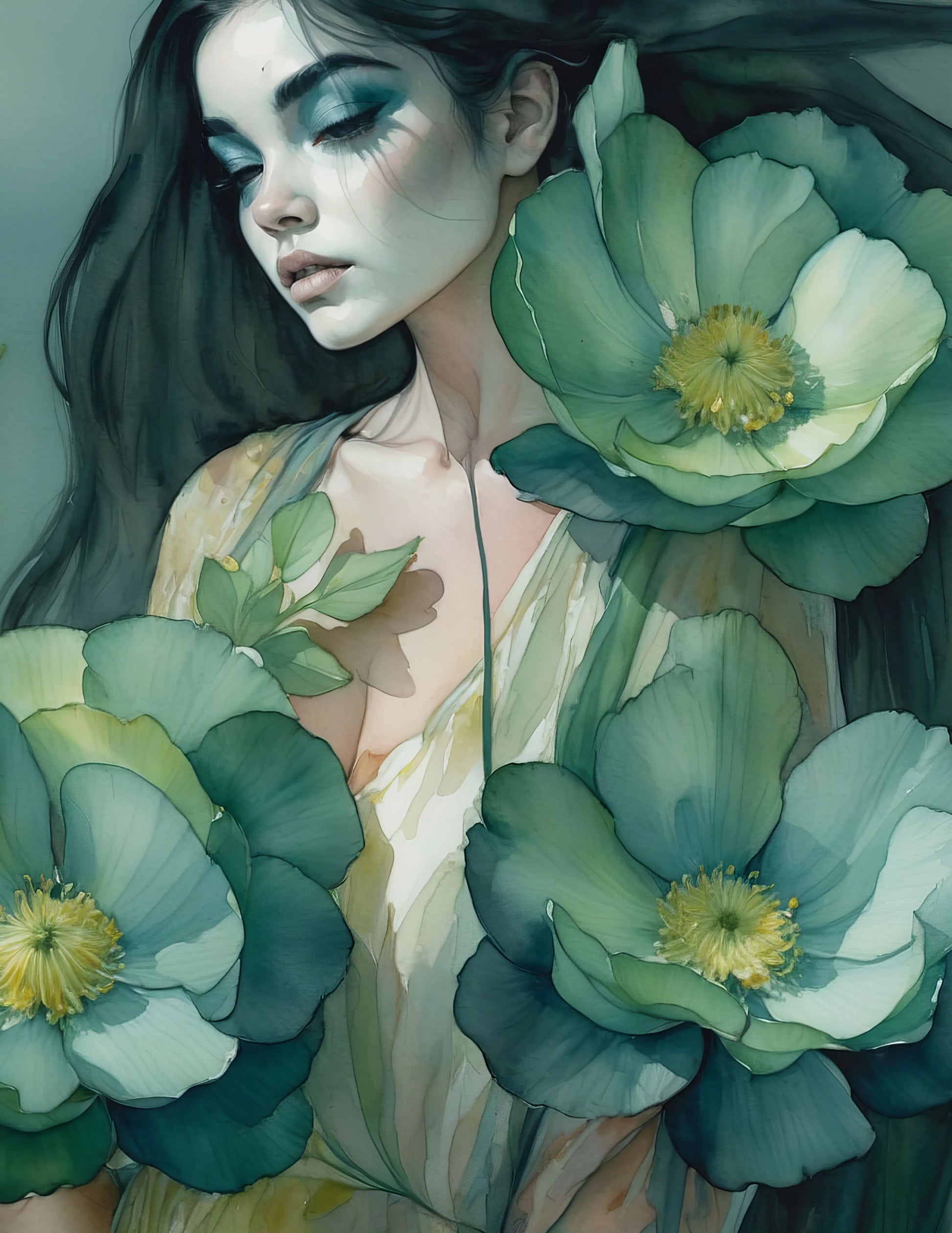 Dramatic Bohemian art piece of beautiful woman surrounded in soft florals in tones in blues & greens.